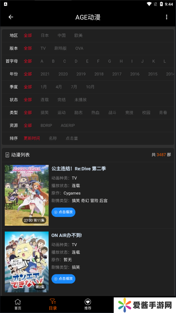2、目录页面:会对动漫进行地区、版本、首字母、年份、季度等排列,方便用户寻找;