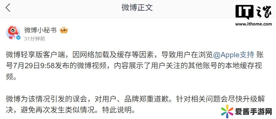 本站 8 月 1 日消息,针对“Apple 支持的账号误发了三星的广告”一事,微博小秘书官方账号今日深夜发文称: