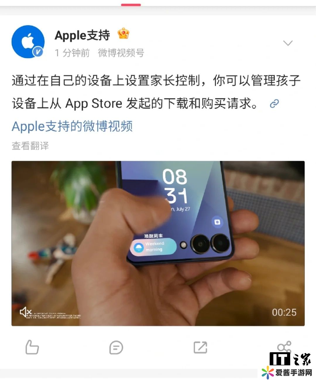 本站注意到,网上截图显示该账号在微博上发布了一则消息,配文是介绍苹果设备的家长控制功能,但是下面配的视频却是三星 Galaxy Z Flip7 的宣传视频。