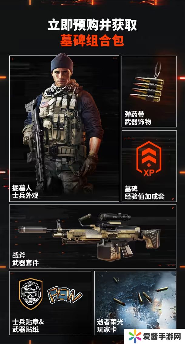 预购奖励主要是墓碑组合包,包含掘墓人士兵外观、“逝者荣光”玩家卡、“弹药带”武器饰物、“快递”武器贴纸、“战斧”L110 武器套件、“末日预言者”士兵贴章等。