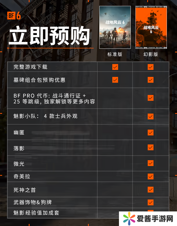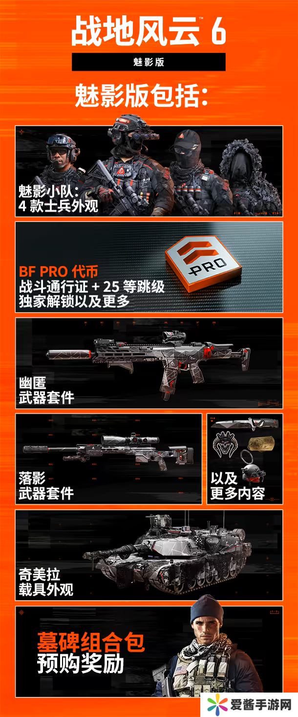 《战地风云 6》幻影版内含《战地风云》Pro 版代币、幻影组合包、武器组合包等。此外还可获得预购奖励墓碑组合包,内含士兵皮肤和墓碑经验值加成套装。