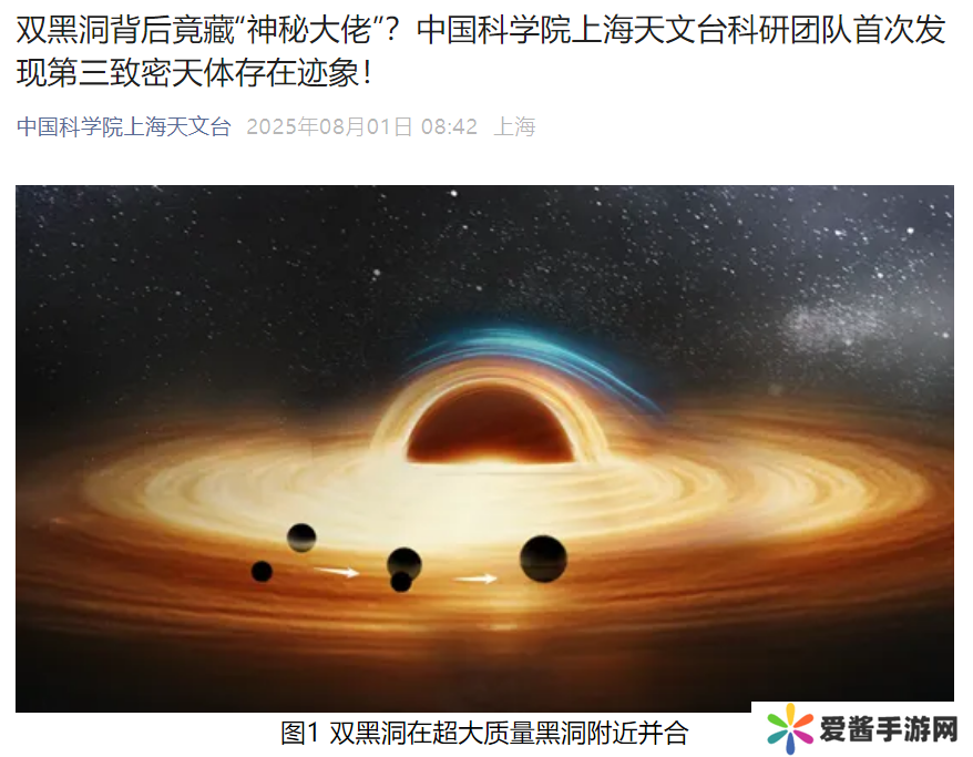 中国科学院上海天文台今日宣布,韩文标研究员带领的科研团队在引力波天文学领域取得突破性进展,首次发现双黑洞并合事件可能发生在第三个致密天体附近。这一成果为揭开双黑洞的形成之谜提供了全新线索,相关成果于 2025 年 8 月 1 日发表在国际天文学学术期刊《天体物理杂志快报》(The Astrophysical Journal Letters)上。