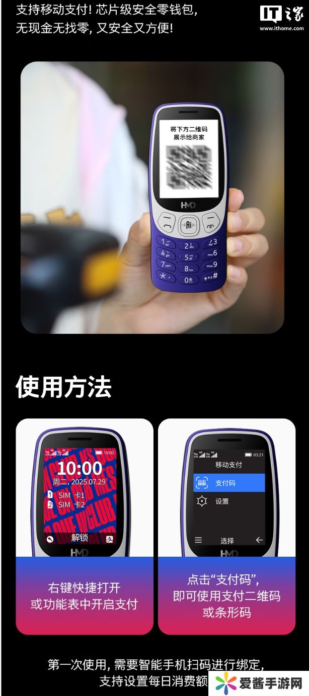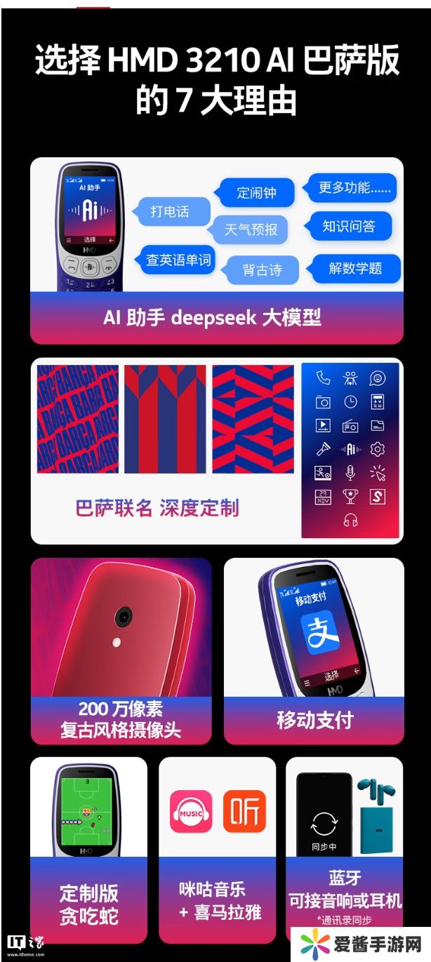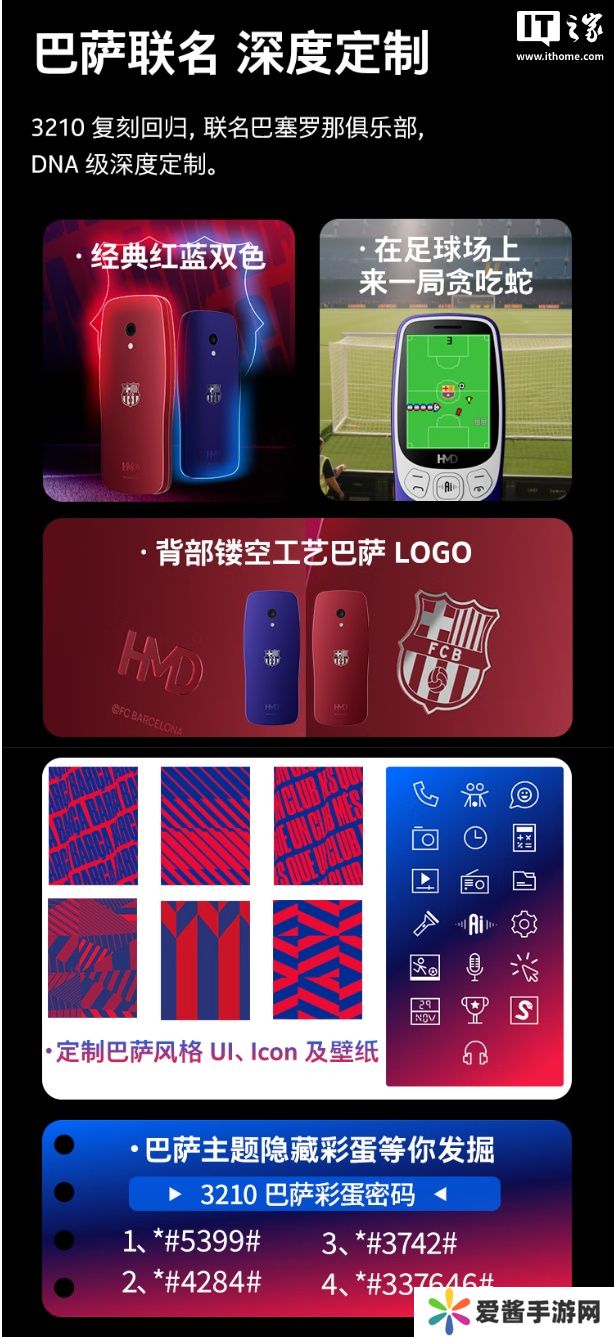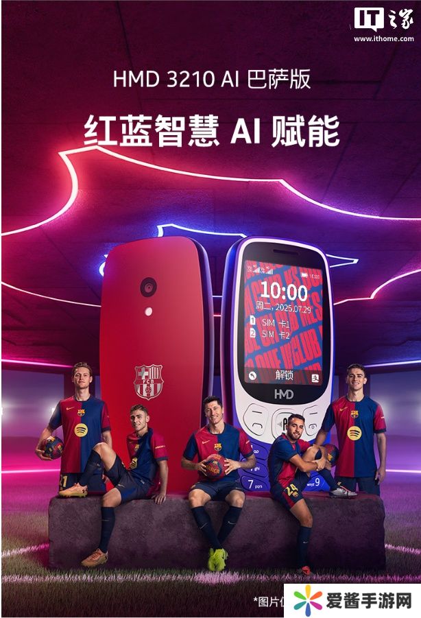 本站 8 月 1 日消息,HMD Global 旗下巴塞罗那足球队联名版 3210 功能手机现已在京东开启首销,这款功能机配备足球队定制外壳、壁纸、系统界面,同时支持支付宝被扫支付、Deepseek AI 助手,首发价 429 元。