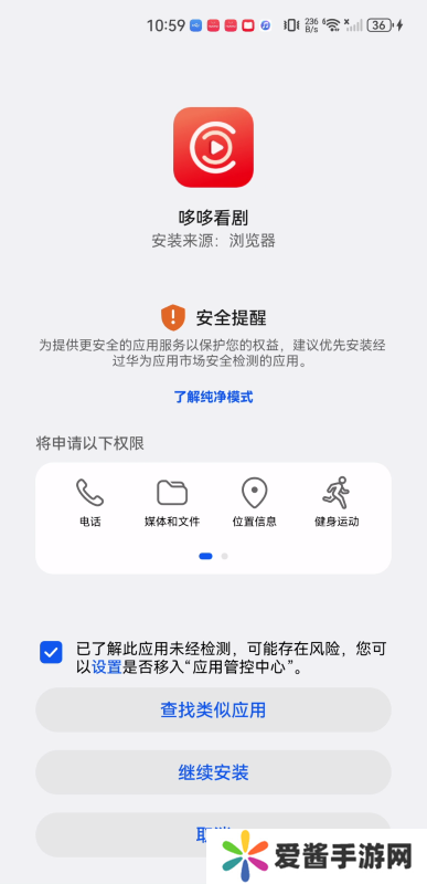 3、接下来点击勾选“已了解此应用未经检测……”,点击“继续安装”。(还可以点击了解纯净模式)