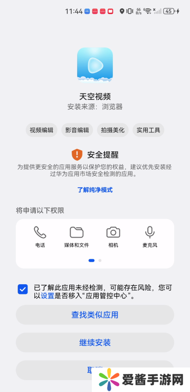 3、第三步,点击勾选“已了解此应用未经检测……”,然后再点击“继续安装”。(出现安全提醒,不用惊慌)