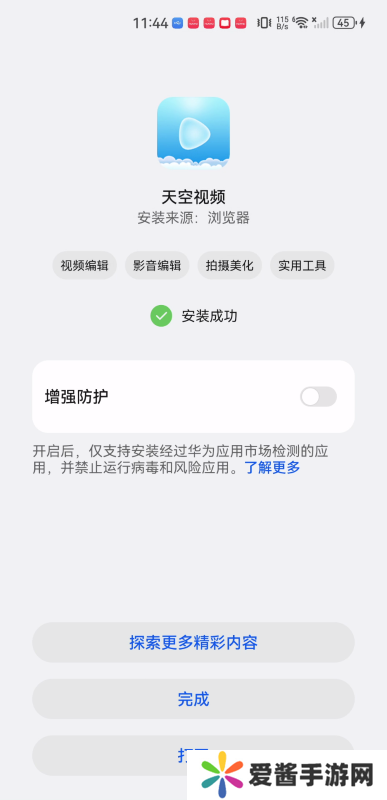 5、最终,出现绿色对号,说明“安装完成”,点击打开,即可体验。