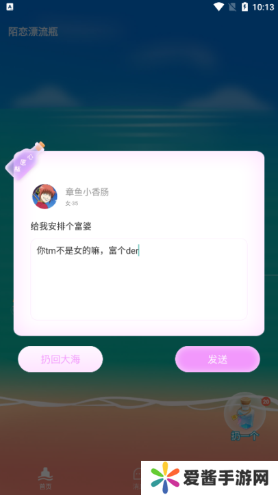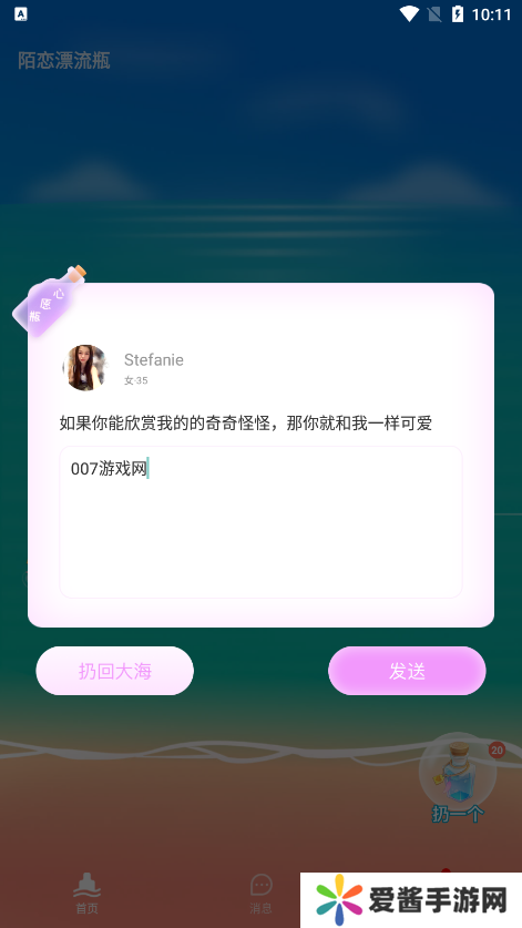 2、通过投掷和捡起虚拟漂流瓶与世界各地的单身人士联系;