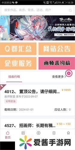 1、打开画师联盟APP,软件首页如下图所示,包括Q群汇总、网站公告、企业服务、赞助联盟。
