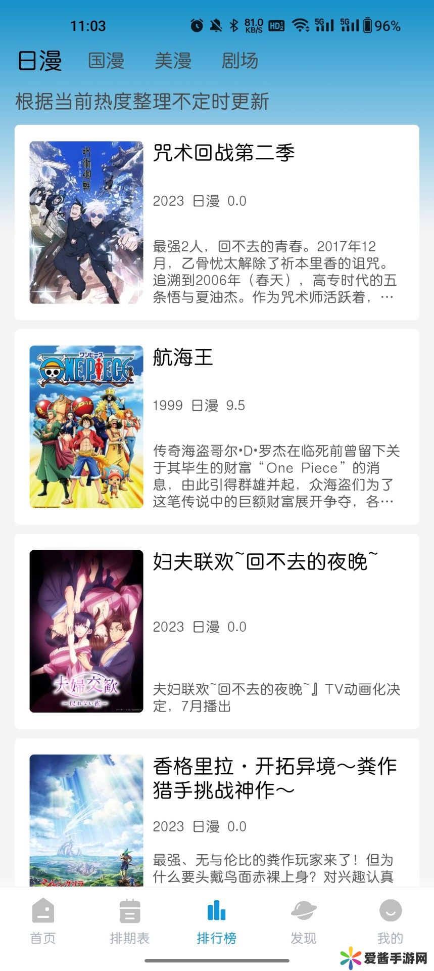 1、人气排行,将最近热门的动画进行排名,根据热度整理出来的,不定时就会进行数据更新。