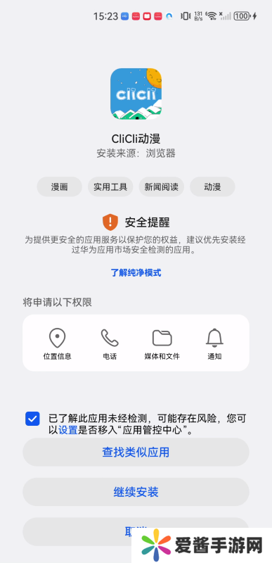 3、第三步,点击勾选“已了解此应用未经检测……”,然后再点击“继续安装”。(出现安全提醒,不用惊慌)