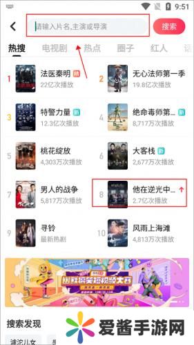 2、会看见很多的近期热搜推荐,如“法医秦明、无心法师第一季、特警力量、绝命毒师、桃花绽放、大客栈、男人的战争、以及他在逆光中”,这里小编选择他在逆光中,作为示例,如果推荐中没有你想要的,在搜索框搜索即可。