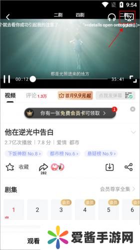 3、随后进入了播放界面,影片开始播放,这时可以看见,右上角有个TV的标志,点击即可, 如果有的是灰的,那可能是版权不支持。