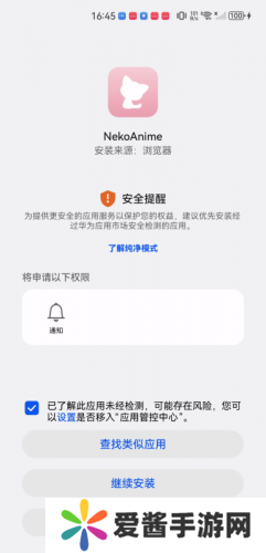 3、第三步,点击勾选“已了解此应用未经检测……”,然后再点击“继续安装”。(出现安全提醒,不用惊慌)