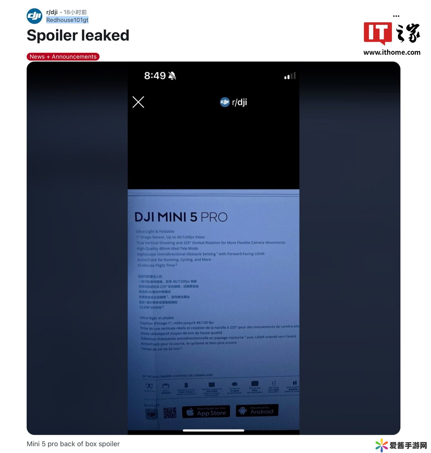 大疆 DJI Mini 5 Pro 无人机宣传物料曝光:1 英寸传感器、提供前向激光雷达