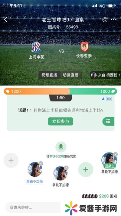 比赛结果预测等,用户可以通过加入或创建圆桌来和其他球迷进行在线实时文字、语音互动