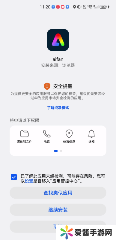 3、第三步,点击勾选“已了解此应用未经检测……”,然后再点击“继续安装”。(出现安全提醒,不用惊慌)