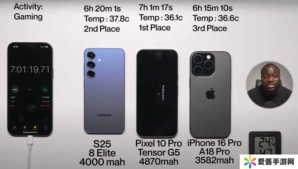 最终成绩显示,iPhone 16 Pro(3582mAh 电池,A18 Pro 芯片,3nm 工艺)坚持了 6 小时 15 分钟;Galaxy S25 成绩为 6 小时 20 分钟;Pixel 10 Pro 则在 Asphalt 游戏加载阶段才彻底耗尽电量。