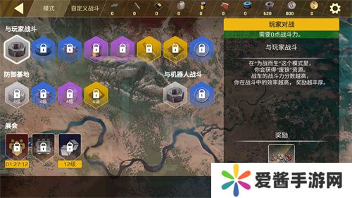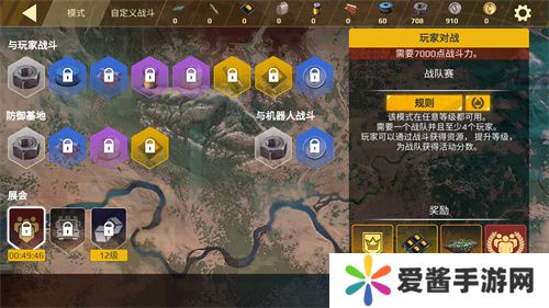 如下图所示,战斗的选择界面分为三大块:与玩家战斗、防御基地和与机器人战斗,以及乱斗模式的“展会”。通常来讲,“防御基地”接近于我们传统认知中的PvE:定时刷新敌人,保护目标点。