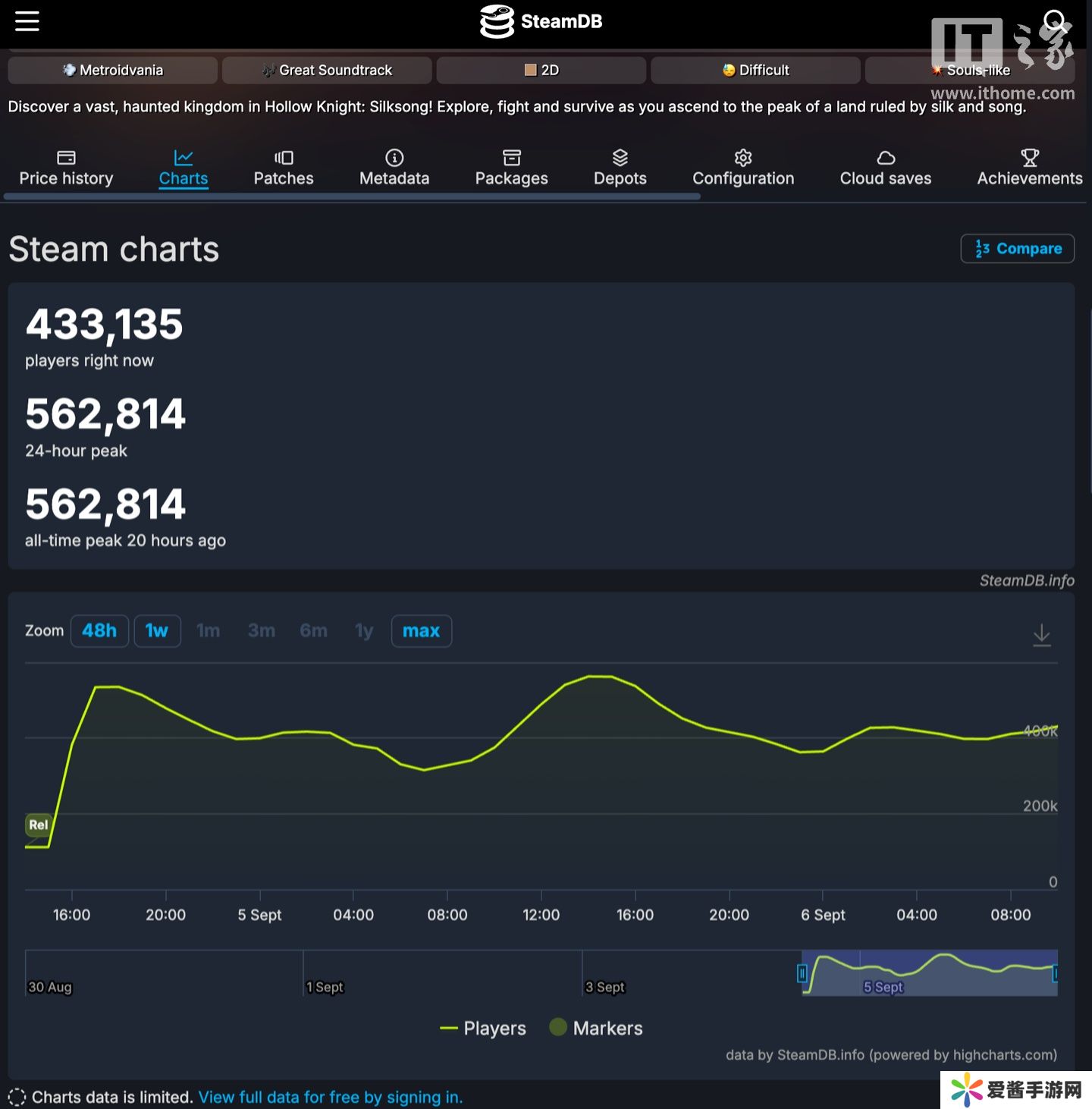 本站 9 月 6 日消息,SteamDB 数据显示,独立银河恶魔城游戏《空洞骑士:丝之歌》在 Steam 上峰值在线玩家达 562814 人,目前活跃玩家稳定在 412000 人以上。该作由澳大利亚三人团队 Team Cherry 打造,发售后迅速冲入 Steam 历史前 20 名榜单。
