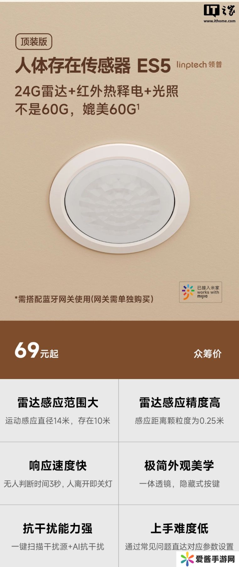 本站 9 月 7 日消息,领普现已在小米有品上架一款顶装人体存在传感器 ES5,其主打“雷达、红外、光照检测三感合一”,众筹价单只定价为 69 元、三只定价为 198 元。商品地址(点此访问)。