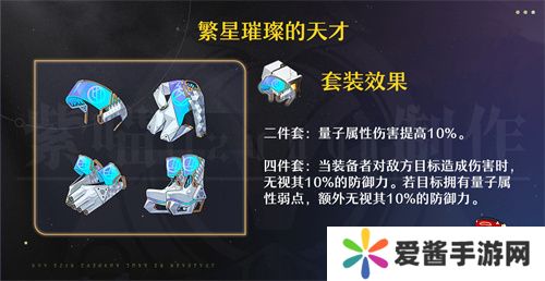解析:这个套装提供量子增伤、无视防御,和需要敌人有量子弱点才能获得的额外无视防御。只要敌人有量子弱点就可以吃满效果,但若是没有就会损失一部分增益。好在一般会让翡翠在量子环境中上场,在队伍中减防没有溢出时也是一个不错的泛用选择。