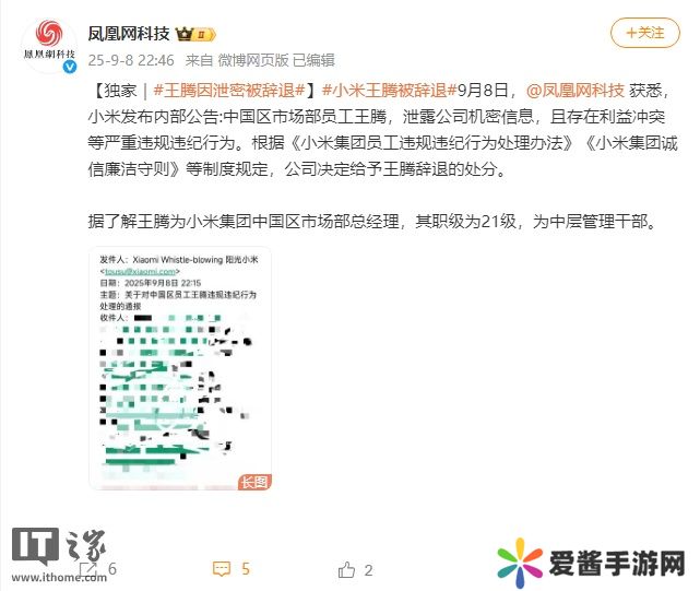 本站 9 月 8 日消息,据凤凰网科技报道,小米发布内部公告:中国区市场部员工王腾,泄露公司机密信息,且存在利益冲突等严重违规违纪行为。根据《小米集团员工违规违纪行为处理办法》《小米集团诚信廉洁守则》等制度规定,公司决定给予王腾辞退的处分。