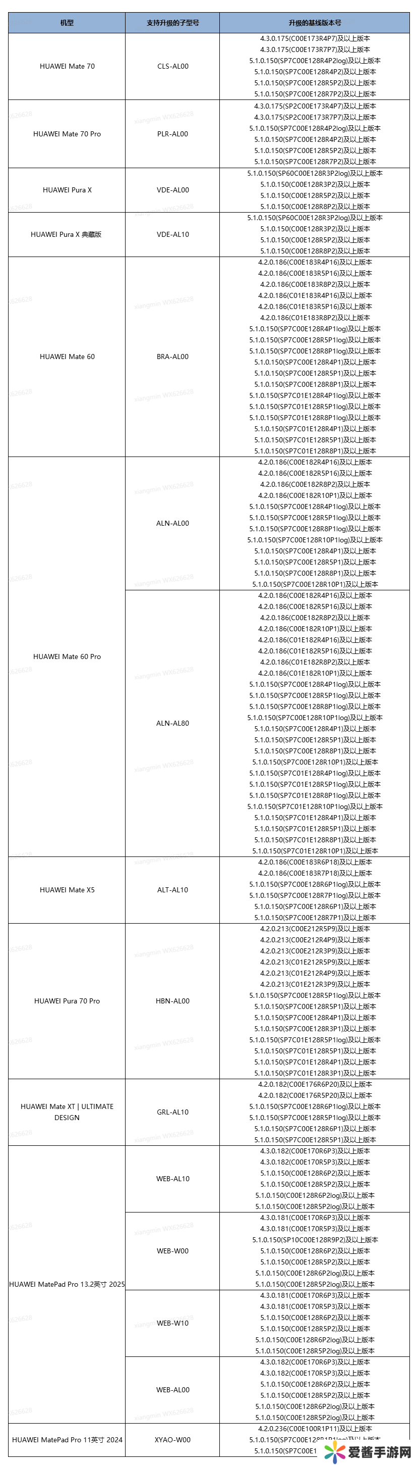 A:当前仅支持在中国大陆使用且在基线版本的以下机型:HUAWEI Mate 60、HUAWEI Mate 60 Pro、HUAWEI Mate 70、HUAWEI Mate 70 Pro、HUAWEI Mate X5、HUAWEI Mate XT | ULTIMATE DESIGN、HUAWEI Pura X、HUAWEI Pura X 典藏版、HUAWEI Pura 70 Pro、HUAWEI MatePad Pro 13.2 英寸 2025、HUAWEI MatePad Pro 11 英寸 2024。具体支持升级的机型及子型号详见“机型及基线版本清单”。不同产品的版本规划有所不同,其他机型升级计划请您关注后续华为官方消息。