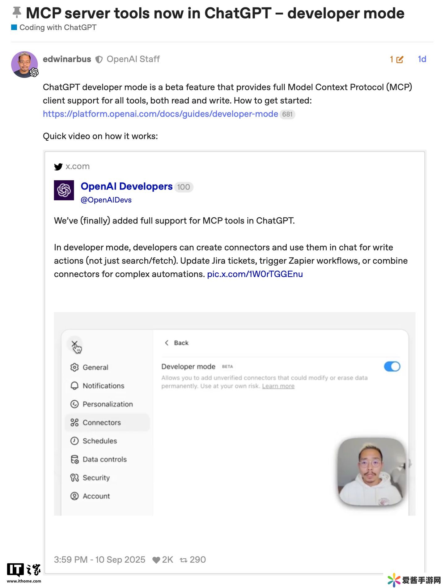 本站 9 月 11 日消息,OpenAI 发文,宣布开始为 ChatGPT 带来“开发者模式(Developer Mode)”,用户可以在该模式下接入 MCP (Model Context Protocol)客户端。不过相应功能目前暂时仅上线网页端,同时仅支持 Plus / Pro 订阅用户使用。