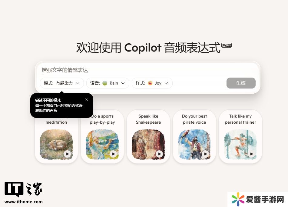 本站 9 月 11 日消息,微软为其 Copilot 工具新增了一个“Copilot 音频表达式”功能,该功能基于微软自研的 MAI-Voice-1 模型,目前用户可从三种不同的语音模式中进行选择。