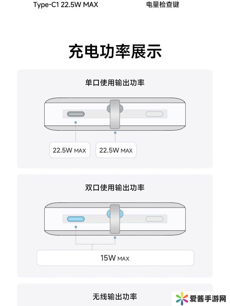 自带线以及 Type-C 口均支持最高输出 22.5W,双口同时输出为 15W,无线输出功率 7.5W。