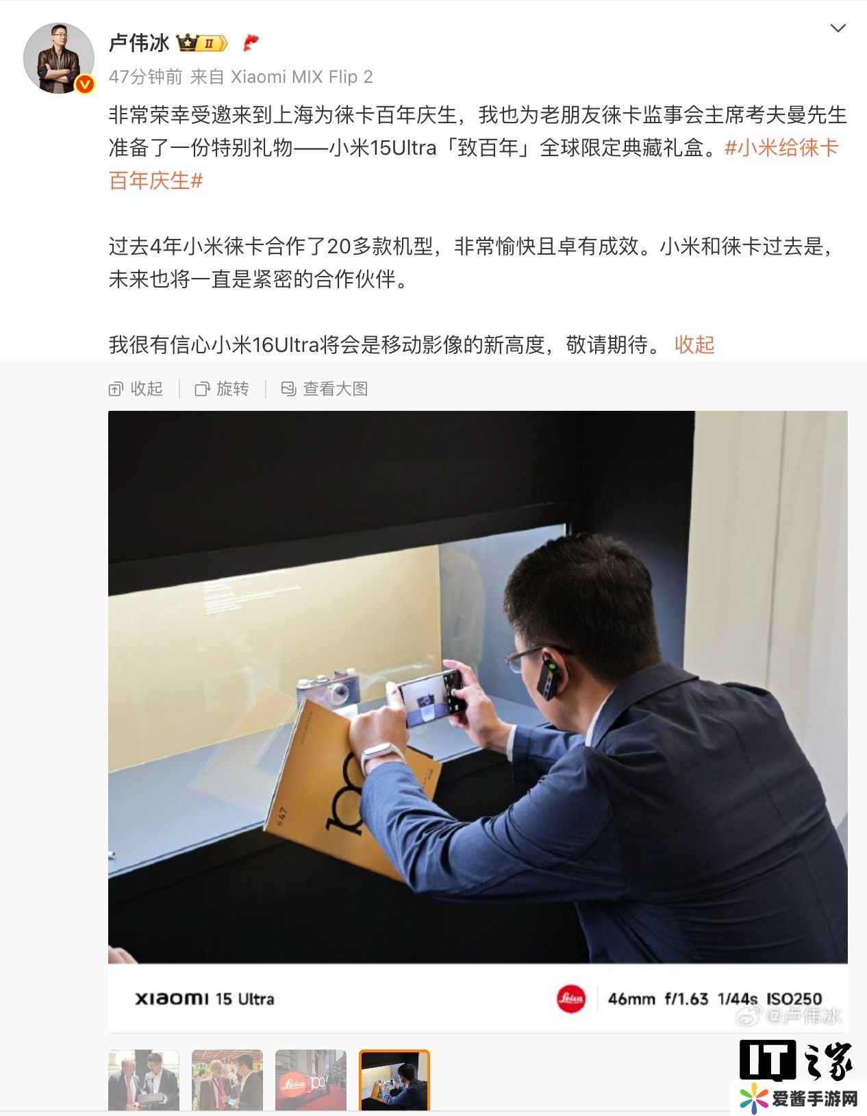 卢伟冰还曾在今年 7 月发文称,自己受邀来到上海为徕卡百年庆生。卢伟冰自信写道:“我很有信心小米 16 Ultra 将会是移动影像的新高度,敬请期待。”从目前的情况来看,小米 16 Ultra 预计将改名小米 17 Ultra。