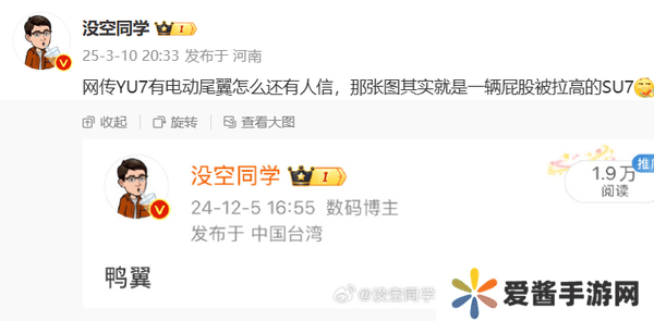 最近,网传小米YU7有电动尾翼。对此,有数码博主吐槽称:“网传YU7有电动尾翼怎么还有人信,那张图其实就是一辆屁股被拉高的SU7。”之前博主就强调YU7车尾用的是鸭翼。