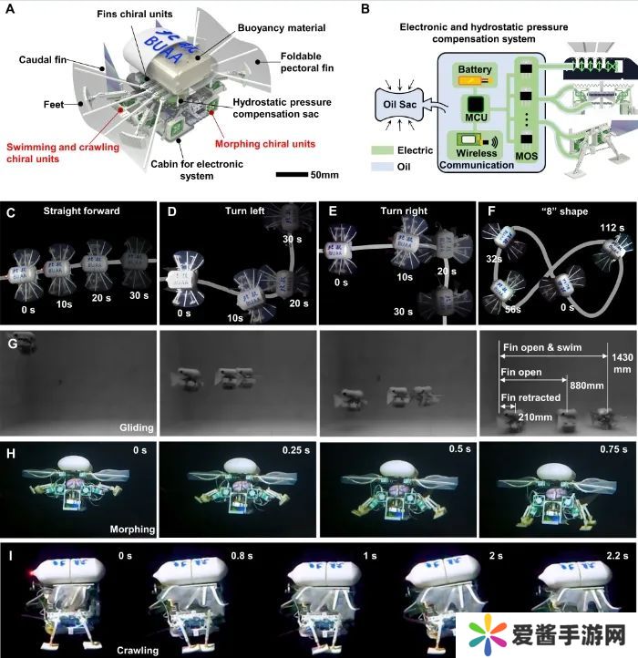 研究团队从蝙蝠鱼的运动模式中汲取灵感,设计出能够游动、滑翔、爬行的多模态机器人,并利用手性双稳态超材料结构实现 0.75s 内的游动-走动快速转换,适应不同的海底地形和任务需求。