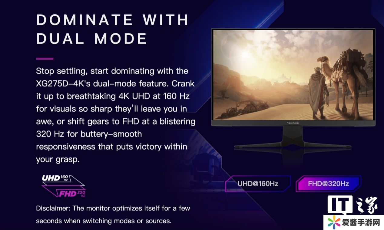 本站 3 月 20 日消息,优派(ViewSonic)近日于其海外官网上线了一款双模电竞显示器 XG275D-4K。该显示器支持在 4K 160Hz 及 1080P 320Hz 两种模式间切换,并适配 Xbox 及 PlayStation 5 游戏机。目前该显示器暂未在国内电商平台上线。