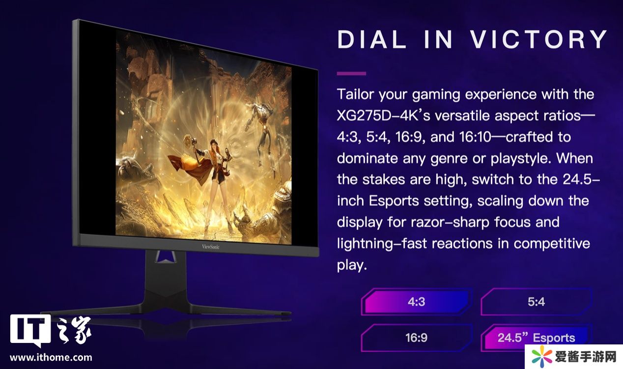 为照顾不同玩家需求,该显示器提供 4:3、5:4、16:9 及 24.5 寸电竞比例。机身背面可兼容 VESA 壁挂支架。官方称该显示器经过 macOS 测试,并能与 Xbox 及 PS5 兼容,为不同生态玩家提供良好的使用体验。