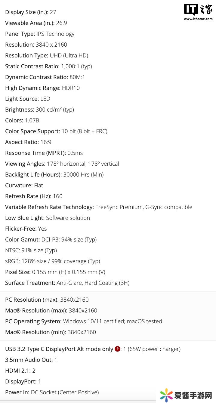 该显示器采用电竞风格外观设计,背部有一根“V”字形状 RGB 灯带,显示器自带升降支架,可进行 130mm 的高度调节、90 度垂直旋转及-3~20 度的俯仰调节。该显示器采用一块 27 寸的 Fast IPS 面板,比例为 16:9,具备 4K 160Hz 及 1080 320Hz 两种显示模式,兼顾单机及网络游戏的体验;屏幕响应时间为 0.5ms,屏幕最高亮度 300 尼特;支持 94% 的 PCI-P3 色域和 99% 的 sRGB 色域;通过 8bit+FRC 技术达到 10 bit 色深。