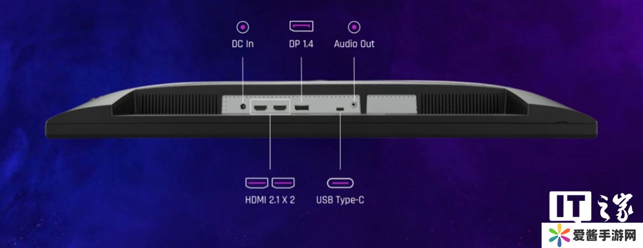 该显示器在 IO 接口方面,有一个 DC 电源接口、两个 HDMI2.1 接口、一个 DisplayPort 1.4 接口、一个 USB Type-C 接口,以及一个音频输出接口。Type-C 接口最大可提供 65W 的反向电源输出。