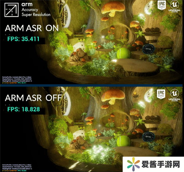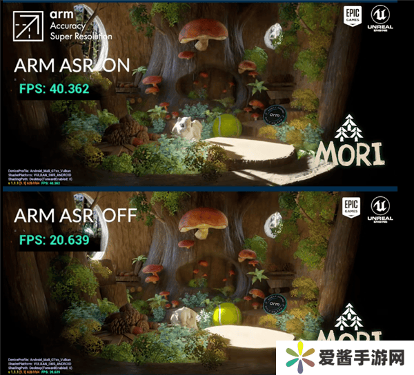 为了展示ASR技术的实际效果,Arm还利用虚幻引擎5演示了游戏《Mori 林间鼯语》。该演示采用了面向移动端的桌面渲染器,结果显示ASR技术将帧率提升了至少30%,甚至在某些场景下达到了100%的提升,从原本的约20FPS跃升至35-40FPS,同时保持了精细的细节与几乎不受影响的画质。