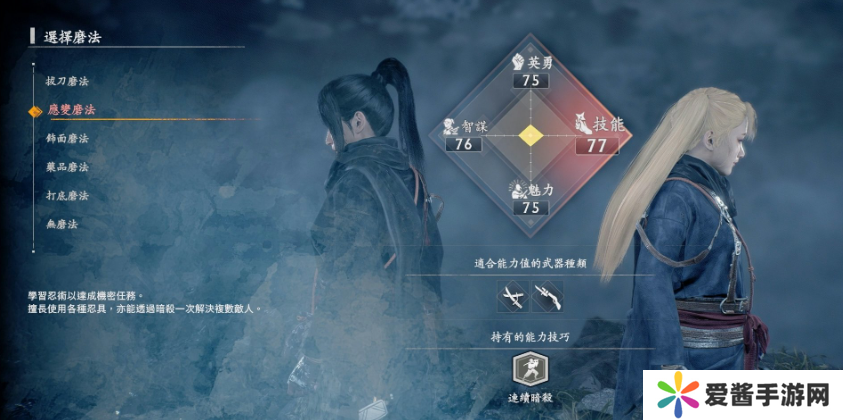 磨法即初始角色属性的选择,但是《浪人崛起》没有点数分配,累积经验升级只会获得技能点来学习不同系统的技能,不同磨法的分别就只有初始获得的技能不同,后续都可以在游戏升级、解收集获得技能点全部学到。