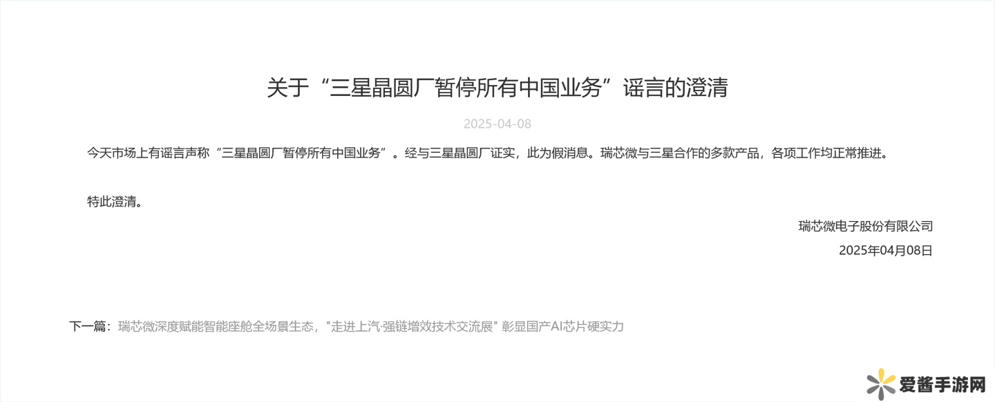 近期,有关“三星晶圆厂全面叫停中国业务”的传闻在网络上引起了广泛关注。对此,国内知名芯片设计厂商瑞芯微迅速作出反应,通过其官方网站发布了正式的澄清声明。