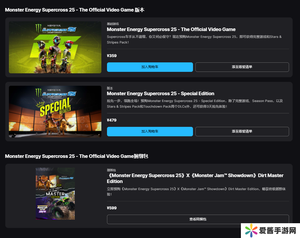 《怪物能量超级越野赛车25》是一款摩托车越野体育竞速游戏,而这款游戏的售卖版本目前只有标准版、特别版和尘土大师版,标准版售价为359元人民币、特别版售价为479元、大师版售价为599元。