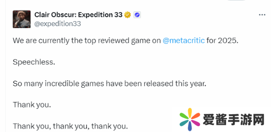 法国工作室Sandfall Interactive的处女作《光与影:33号远征队》,目前以92分的超高评价稳居Metacritic和Opencritic 2025年度游戏评分榜首。面对这一成就,开发团队在社交媒体曾连用四个“感谢”表达难以置信的惊喜:“今年有那么多杰出的作品问世,我们真的无言以对。”