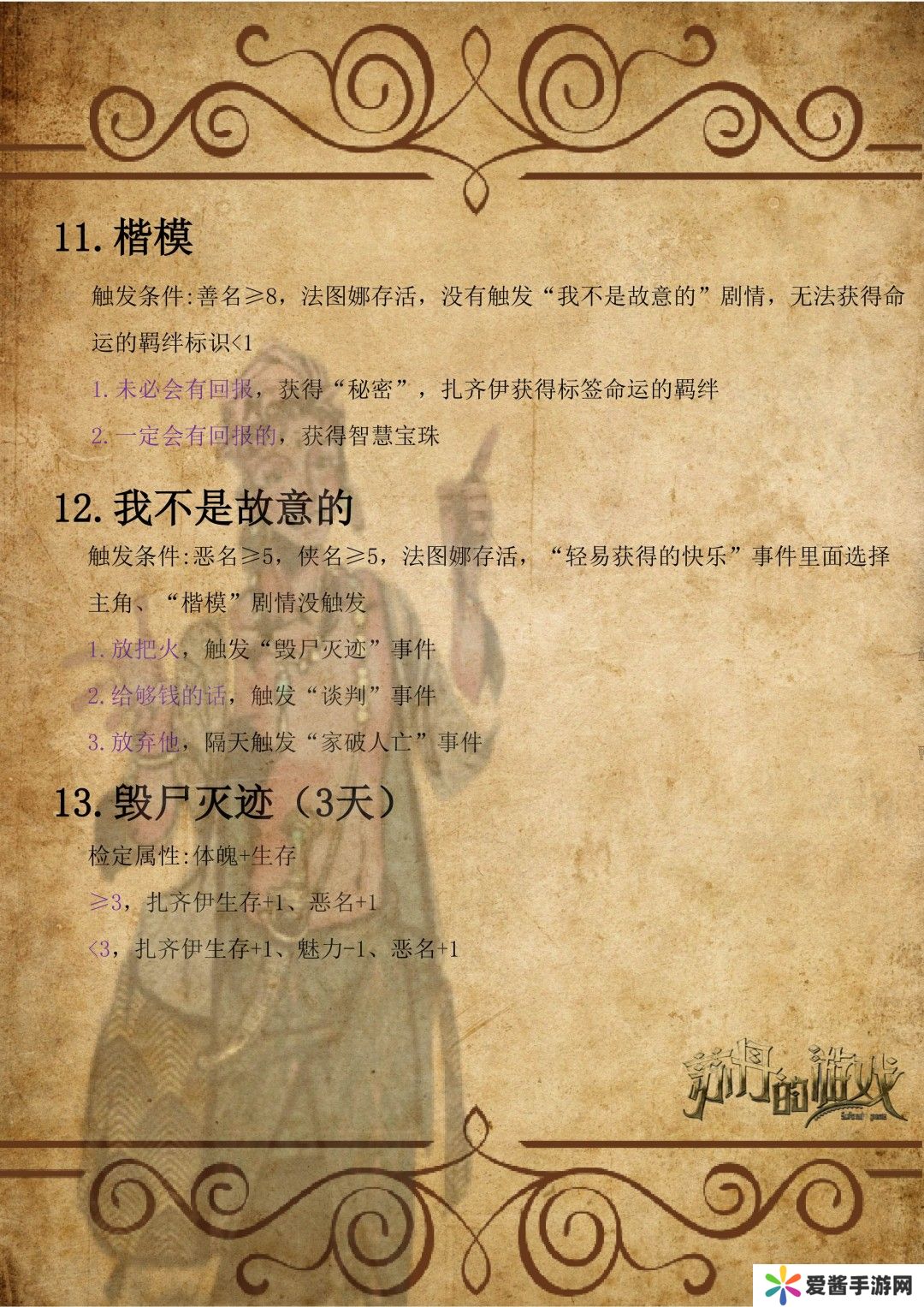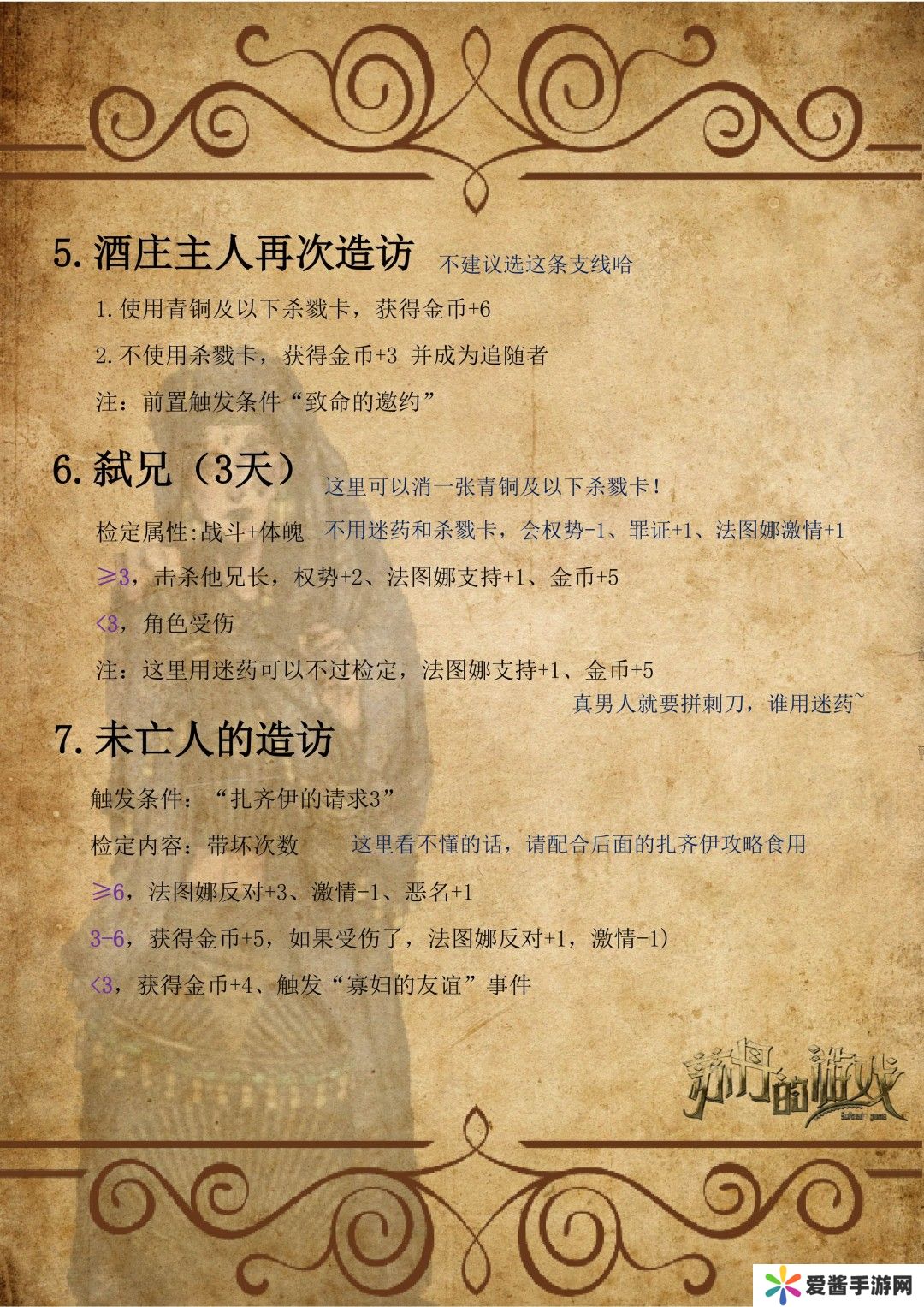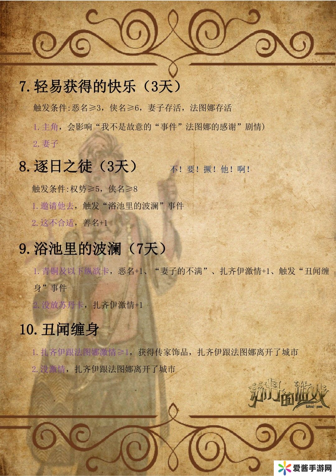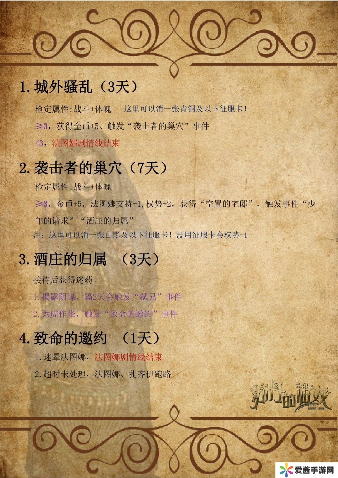 《苏丹的游戏》中攻略法图娜和扎齐伊支线的复杂度堪称游戏之最,因此很多玩家不知道怎么攻略他们,首先,城外骚乱(3天),检定属性:战斗+体魄,这里可以消一张青铜及以下征服卡!