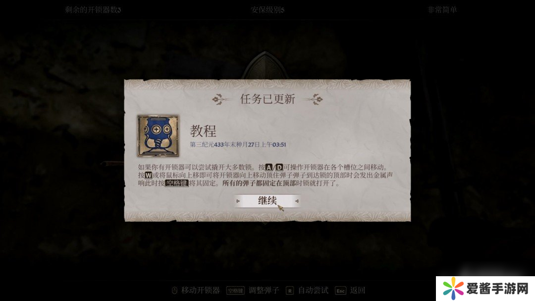 怎么操作官方教程写的非常详细了,用AD键来调整槽的位置,W或者鼠标上移来戳弹子,弹子到一定的位置听到金属声按空格或者左键将其固定即可。这里还有一点需要提到的是,开锁的时候用R键会自动尝试,也就是自动开锁,不过这个功能一般只有低级的锁比较好用。