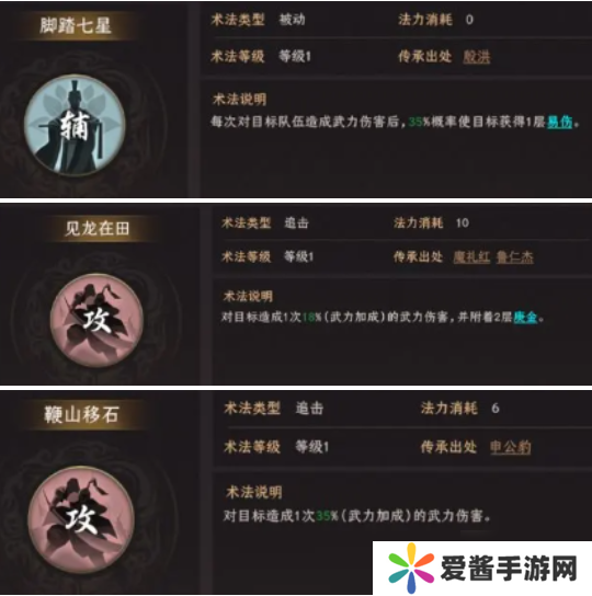 2、术法推荐:黄天化可带一手飞身托迹降低目标武力、防御,提升对武力队的克制性,另外减防可提供额外增伤乘区;另一个战法栏可选择倍率较高的鞭山移石打伤害。