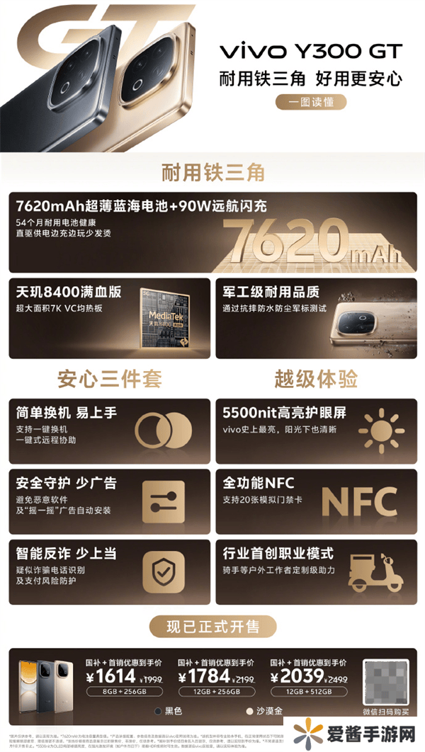 在其他功能方面,vivo Y300 GT同样表现出色。它支持全功能NFC、红外遥控以及双频GPS+三频北斗定位,为用户提供了更加便捷的生活体验。该手机还支持外卖职业模式,为外卖小哥等职业用户提供了更加贴心的服务。