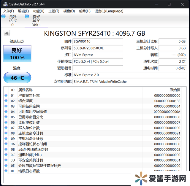 在基准测试中,Kingston FURY Renegade G5 4TB的表现令人瞩目。Crystal Disk Info显示,该硬盘为4096.7GB足容量,采用PCIe 5.0x4传输模式,支持NVMe 2.0标准,以及S.M.A.R.T、TRIM和VolatileWriteCache功能。在27℃室温下,闲时温度仅为46℃,甚至低于主板上的PCIe 4.0系统盘。Crystal Disk Mark实测结果显示,该硬盘的最高连续读写速度分别达到14875.95MB/s和14104.67MB/s,均达到标称值,成为速度最快的SM2508G主控方案的固态硬盘,也是当下最快的PCIe 5.0固态硬盘。