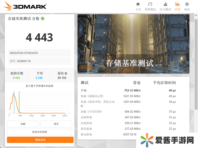 在应用模拟测试中,Kingston FURY Renegade G5 4TB同样表现出色。在PCMARK10完整系统盘基准测试中,该硬盘的最终成绩为4652分,带宽为722.65MB/s,平均存取时间为35μs。在3DMark存储基准测试中,该硬盘模拟了三款游戏的安装、加载、录制和保存等操作,最终得分为4443分,平均带宽753.12MB/s,平均存储时间40us。