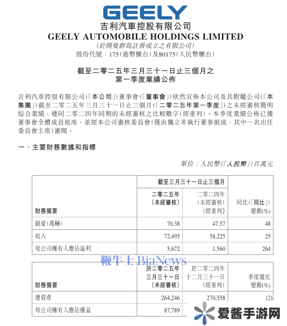 吉利汽车近日揭晓了其2025年第一季度的财务报告,数据显示出强劲的增长态势。该季度,公司总营收攀升至724.95亿元,与前一年同期相比增长了25%。在利润方面,吉利实现了114.37亿元的毛利,税前利润达到66.83亿元,而归属于母公司股东的净利润更是显著增长至56.7亿元,同比增长率高达264%。