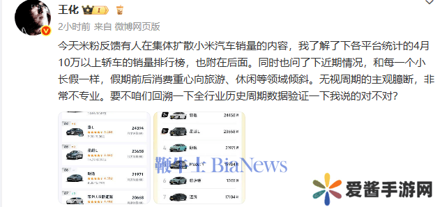 王化在回应中提到,他注意到米粉们反馈有人在网络上集中传播关于小米汽车销量的信息。为了更全面地了解情况,他查阅了各大平台发布的4月份销量排行榜,这些榜单统计了销量在10万辆以上的轿车。同时,他还向内部团队了解了近期的市场动态。